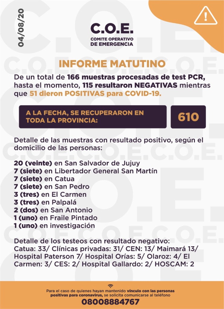 Desde el Comité Operativo de Emergencias, informaron en su reporte matutino, 51 casos nuevos de Coronavirus en la provincia.
