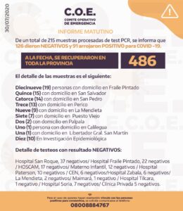 91 positivos nuevos de Coronavirus en Jujuy 30 julio, 2020 Facebook Twitter WhatsAppEl Comité Operativo de Emergencia informó en su reporte matutino, que la provincia registró 91 casos positivos nuevos de Coronavirus. Los casos están distribuidos de la siguiente forma: Facebook Twitter WhatsApp