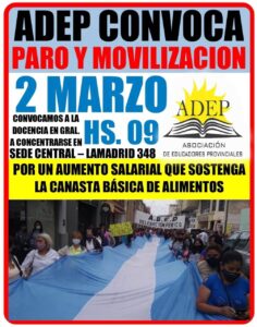 El viernes último, en Congreso Extraordinario, la Asociación de Educadores Provinciales (ADEP) convocó a un paro de 48 horas para este miércoles y jueves, coincidiendo con el inicio del ciclo lectivo de los niveles Inicial y Primario. A las 9 habrá concentración y posterior movilización por las calles de la ciudad.