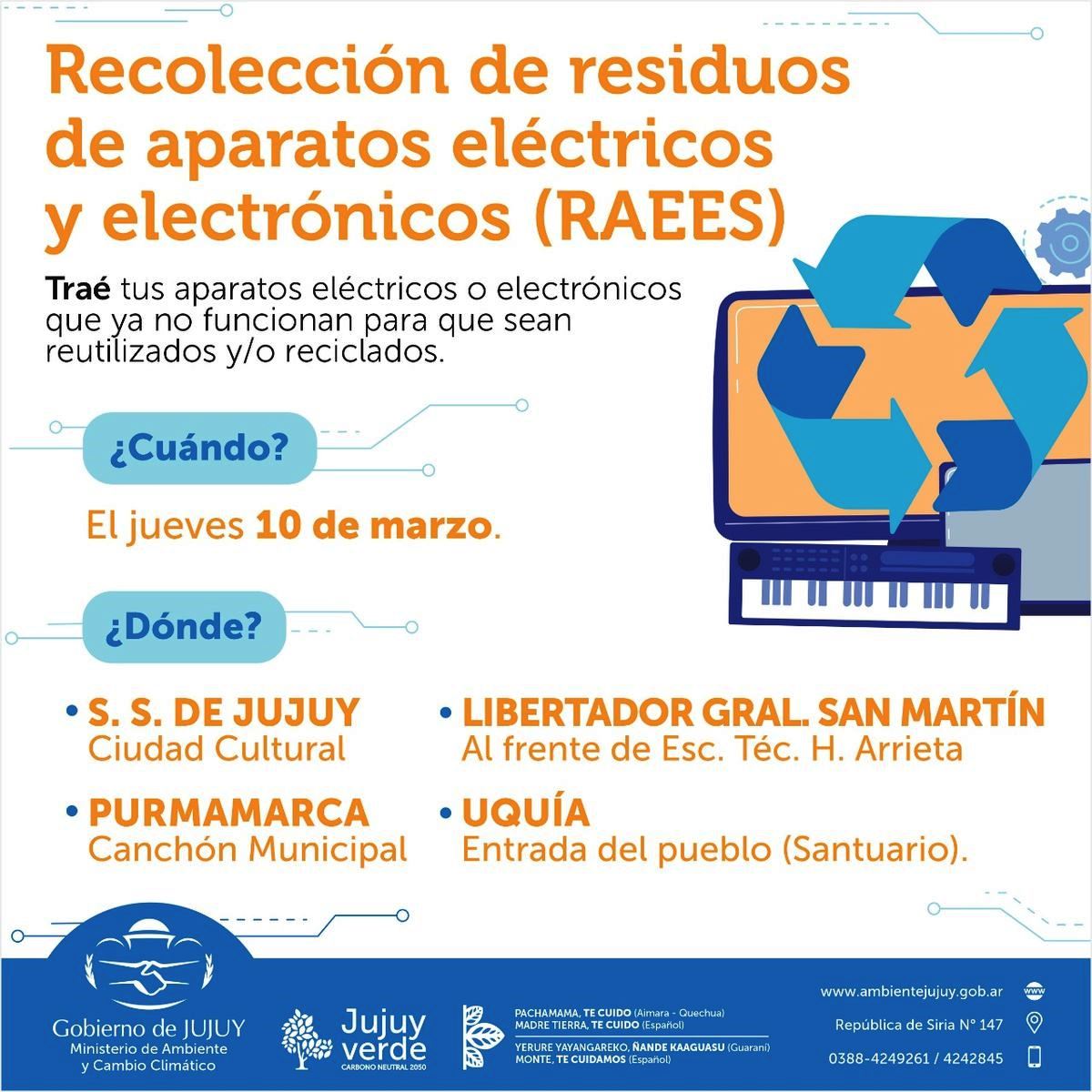La campaña de recolección de residuos eléctricos y electrónicos se realizará 10 de marzo en cuatro puntos estratégicos y será una oportunidad para recolectar aparatos y elementos tecnológicos en desuso, los lugares serán: en Uquia de 10 a 12 en la entrada del pueblo al lado del Santuario; en Purmamarca de 10 a 13 en el Canchón Municipal (calle Florida entre Sarmiento y Belgrano); en Libertador Gral. San Martín de 9 a 14 entre calles Hermano Diego Diez y Jacaranda del barrio 23 de Agosto (frente de la Escuela Técnica Herminio Arrieta); y en San Salvador de Jujuy de 9 a 15 en Ciudad Cultural (entre los baños y la cancha de arena)