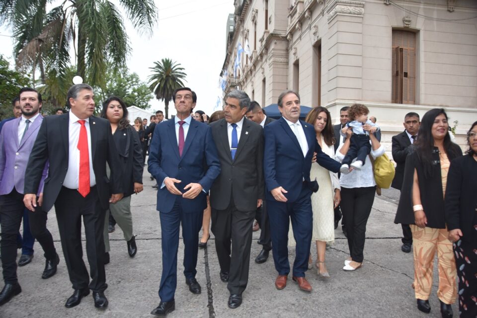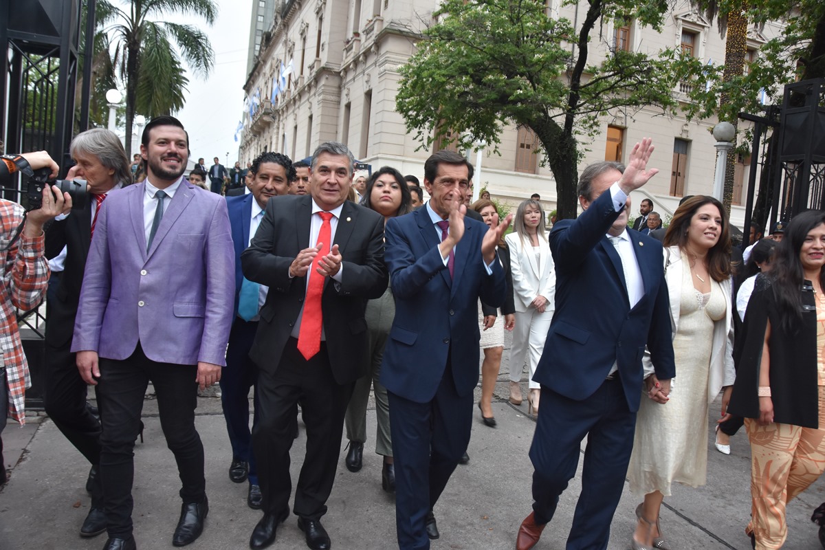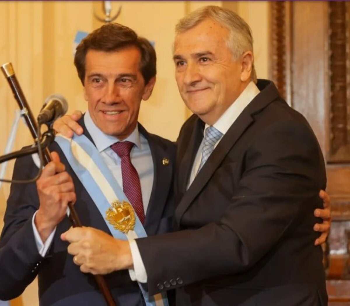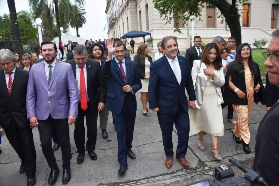 Tras esto, el flamante gobernador recibió los atributos, banda y bastón, por parte del gobernador saliente, Gerardo Morales.