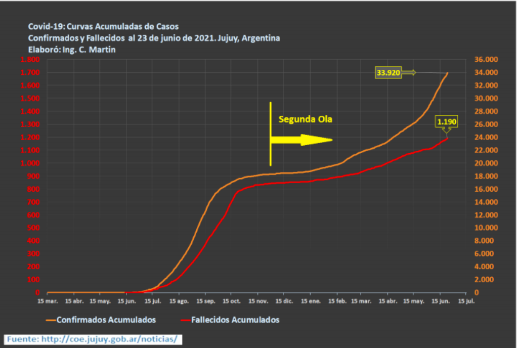 Hasta el 23 de junio de 2021, la segunda ola registra un total de 15.505 casos, siendo el mayor registro de 358 casos confirmados en el día 23/6/2021, el cual se constituye en el récord de casos diarios desde el inicio de la pandemia en la provincia de Jujuy; superando al pico de la primera ola (357 casos confirmados)
