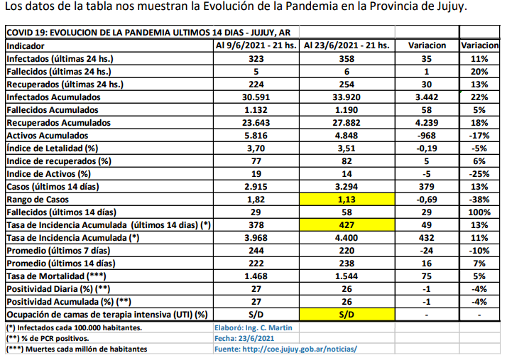 En la provincia de Jujuy al 23 de junio hay una incidencia acumulada de 427 casos por cada