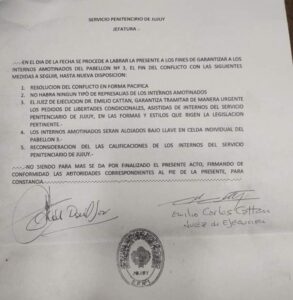 El motín finalizó con la firma de una resolución del conflicto pacífica acordada con los internos del Pabellón N°3 de dicha unidad penitenciaria»