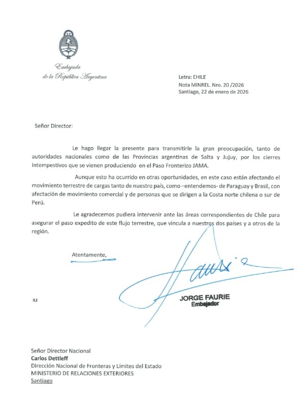 El embajador argentino en Chile y ex canciller, Jorge Faurie, envió una nota formal al Director Nacional de Fronteras y Límites del Estado chileno, Carlos Dettloff, solicitando su intervención para garantizar la apertura del Paso Fronterizo Jama, que permanece cerrado desde el 19 de enero y, según informaron autoridades chilenas, continuaría inhabilitado al menos hasta el lunes 26.