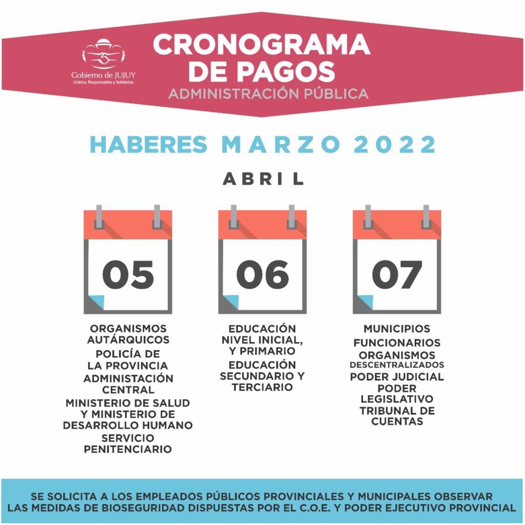 Desde este martes 5 de abril, el Gobierno de la provincia acreditará los salarios de los trabajadores estatales. Hoy comenzará con Organismos Autárquico, Policía de la Provincia, Administración Central, Ministerio de Salud, Ministerio de Desarrollo Humano y Servicio Penitenciario.