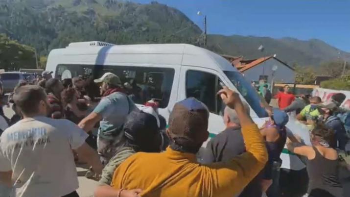 Luego de subir al vehículo, las personas que realizaban la protesta agredieron la combi, con golpes de puño e incluso arrojando piedras: los cascotes rompieron varios vidrios de la camioneta propiedad de la Administración de Parques Nacionales (APN).