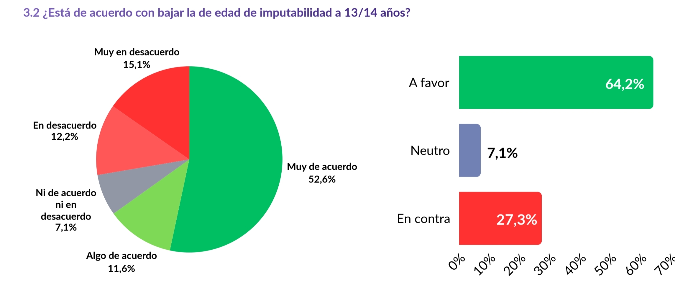 El estudio indica que el 64,2% de los encuestados está a favor de reducir la edad de imputabilidad penal a 13 o 14 años, reflejando una demanda social vinculada principalmente a la seguridad y al reclamo de respuestas más firmes frente al delito.