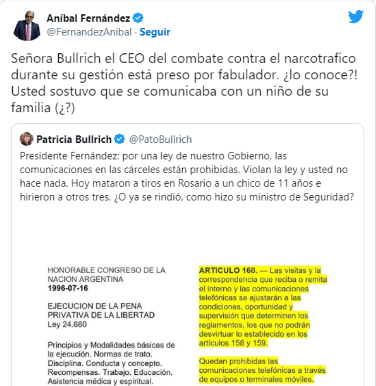 Ante esto, Aníbal Fernández, también un usuario muy activo en sus redes para debatir sobre política, salió a responderle y con una chicana: «Señora Bullrich el CEO del combate contra el narcotráfico durante su gestión está preso por fabulador. ¿lo conoce?! Usted sostuvo que se comunicaba con un niño de su familia (¿?)».