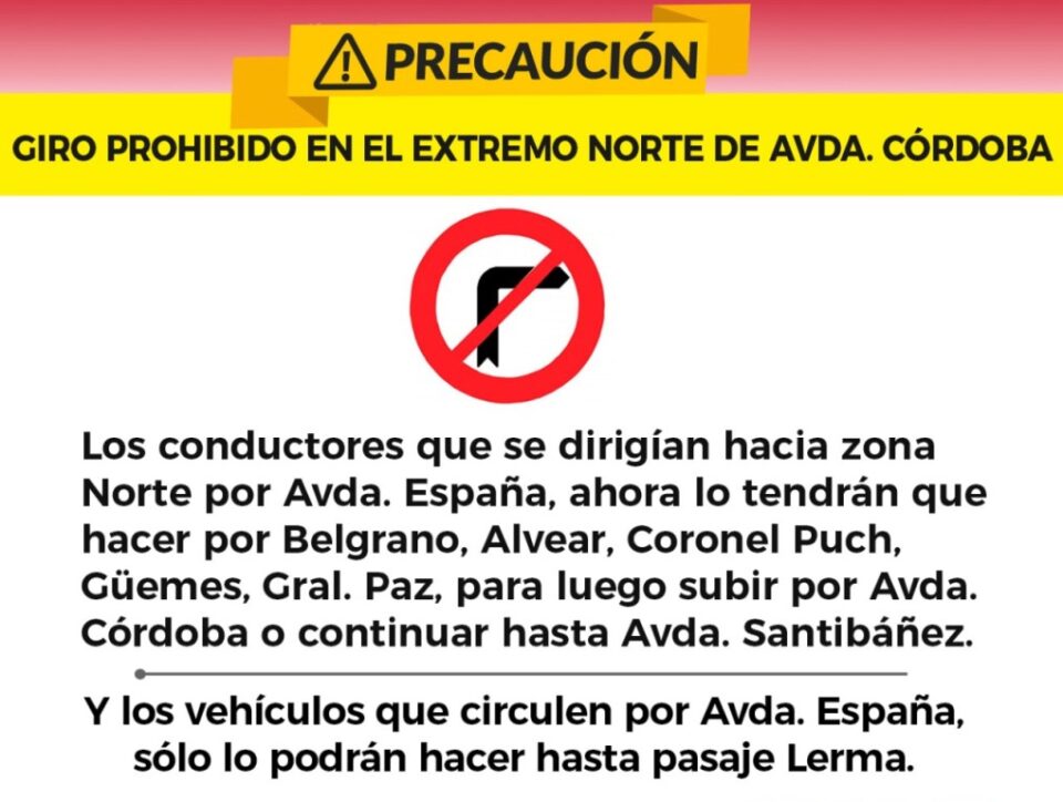 La Dirección general de Tránsito y Transporte del municipio capitalino, informó que debido al avance de las obras de reparación de calzada sobre Av. España, se extendió un nuevo tramo prohibiendo el giro obligatorio hacia Av. Córdoba.