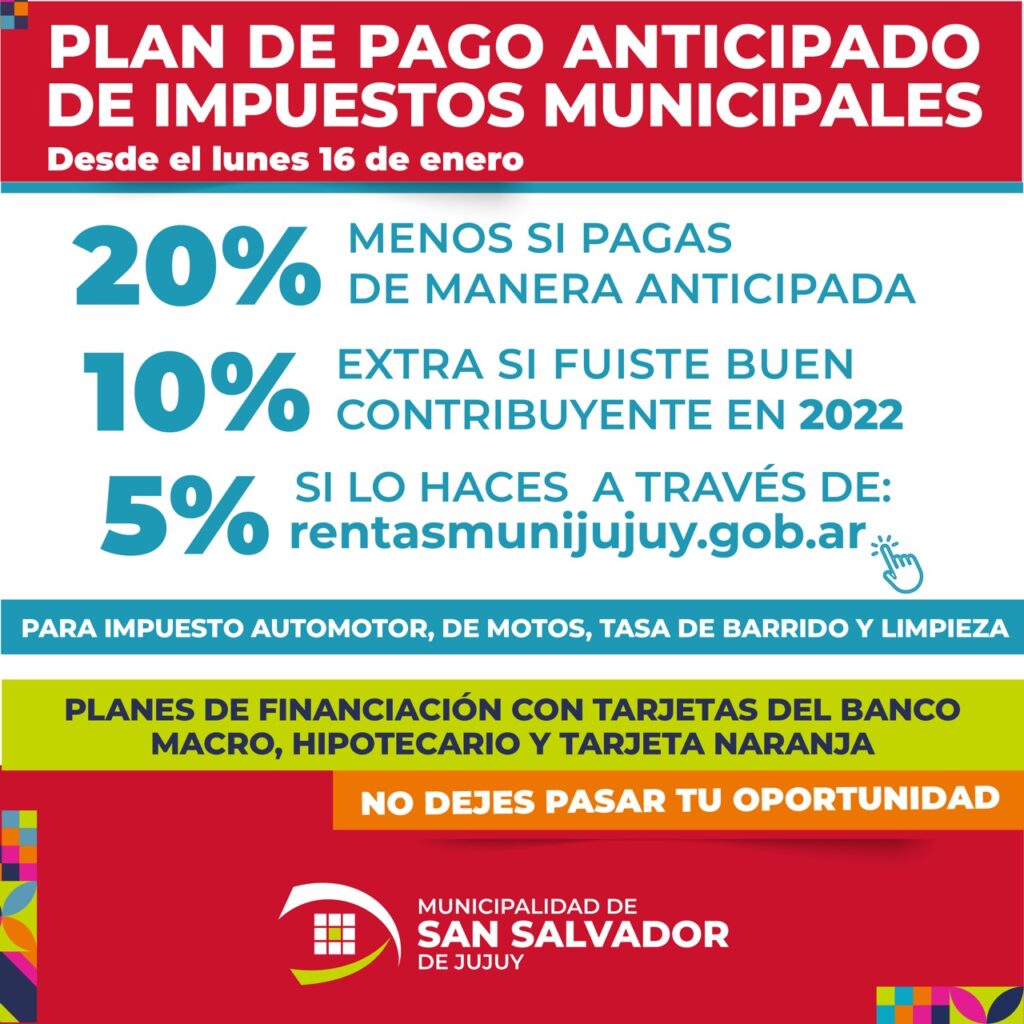 A partir del próximo lunes 16 de enero, todos los interesados podrán acceder al beneficio del 20% en el pago anual anticipado del Impuesto Automotor, Impuesto de Motos, Tasa de Recolección de Residuos y más. A esto, en el caso de quienes fueron “Buen contribuyente” durante 2022 pueden adquirir un 10% más y para evitar aglomeraciones se puede realizar el pago de manera online ingresando a: rentasmunijujuy.gob.ar, sumando un 5% extra de descuento.