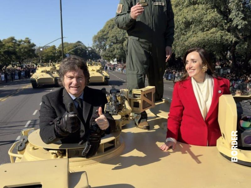 Antes de que termine el desfile militar, el presidente Javier Milei y la vice Victoria Villarruel se subieron a un tanque del Ejército. Un colaborador puso una escalera y otros agarraron al mandatario y a su número dos desde arriba del rodado. Ella subió con tacos.