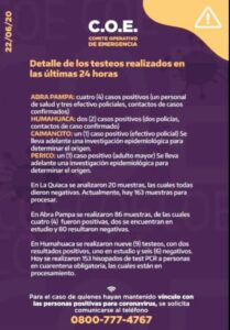 Según indicaron en el informe del COE, en el Laboratorio Central de la provincia se están procesando innumerables testeos. En La Quiaca se realizaron 29 muestras hoy y se procesan además 163 de ayer. Los de hoy corresponden a 22 vendedores de coca, 6 trabajadores de salud y 1 gendarme.