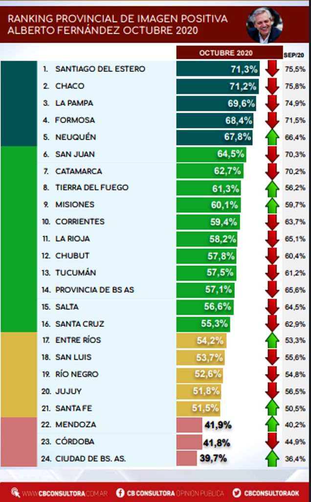 El presidente Alberto Fernández posee su imagen positiva más alta en la provincia del Santiago del Estero (71,3%) y su imagen positiva más baja en la Ciudad Autónoma de Buenos Aires (39,7%). La provincia donde más aumentó su imagen positiva con respecto al mes anterior es en provincia de Tierra del Fuego (+ 5,1 puntos), mientras que en la provincia de Salta es donde más bajó su imagen con respecto al mes de septiembre (- 7,9 puntos).
