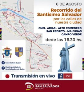 La dirección de Tránsito y Transporte, dependiente de la secretaría de Servicios Públicos, informa a la comunidad en general y a los señores conductores en particular que, en razón de celebrarse el 6 de agosto el día del Santísimo Salvador, se realizará el recorrido de la imagen por distintos puntos de la ciudad, sabiendo que a partir de horas 16.30 iniciará el acompañamiento al patrono de la Ciudad. Este esfuerzo se realiza con toda la precaución y protocolo de bioseguridad, aconsejando a los vecinos permanecer en sus hogares ya que la peregrinación se realizará en vehículo bendiciendo cada hogar en tiempos de pandemia.