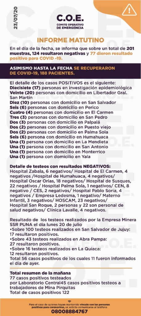 Los test PCR fueron procesados 77 en el Laboratorio Central de la provincia y 56 por un laboratorio privado para Mina Pirquitas, 11 de ellos informados ayer.