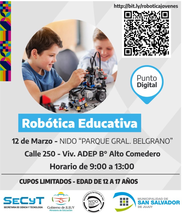 En un trabajo en conjunto entre la Municipalidad de nuestra Capital y el Gobierno de la provincia, se realizará un nuevo taller de Robótica Educativa para niños y adolescentes de 12 a 17 años, el día viernes 12 de 9 a 13, en el NIDO del Parque Gral. Belgrano ubicado en Calle 250 – Viv. ADEP del barrio Alto Comedero.