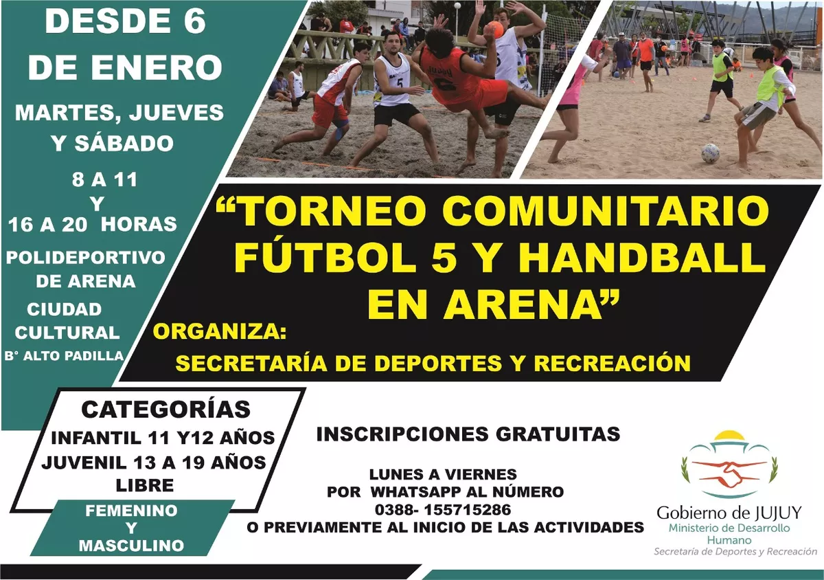 El Ministerio de Desarrollo Humano continúa con las actividades destinadas a promover la práctica y desarrollo de deportes en arena, con ese fin informa que los días martes, jueves y sábado de 8 a 11 y 16 a 20 horas se llevará a cabo el “Torneo Comunitario de Fútbol 5 y Handball en arena, dirigido a varones y mujeres en categorías infantiles de 11 y 12 años, Juvenil de 13 a 19 años y libre, en las instalaciones del Polideportivo de Arena ubicado en Ciudad Cultural de Barrio Alto Padilla.
